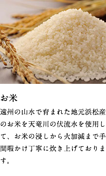 遠州の山水で育まれた地元浜松産のお米を天竜川の伏流水を使用して、お米の浸しから火加減まで手間暇かけ丁寧に炊き上げております。