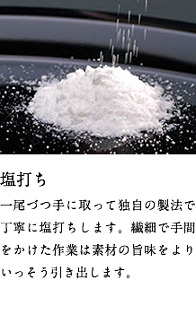 一尾づつ手に取って独自の製法で丁寧に塩打ちします。繊細で手間をかけた作業は素材の旨味をよりいっそう引き出します。