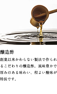 創業以来かわらない製法で作られるこだわりの醸造酢。風味豊かで厚みのある味わい、程よい酸味が特長です。